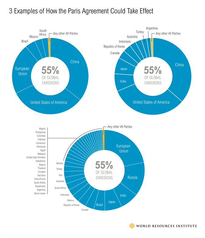 Potpisivanje Pariškog sporazuma prvi je korak u ostvarivanju zadanih globalnih ciljeva kada je riječ o borbi protiv klimatskih promjena. Nakon što su zemlje potpisale sporazum, obvezale su se na daljnje korake koje moraju učiniti unutar svojih granica. Sporazum stupa na snagu trideset dana nakon potpisivanja, nakon što ga je ratificiralo 55 zemalja koje zajedno ispuštaju najmanje 55% svih stakleničkih plinova, odnosno 4. studenoga 2016.